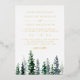 Elegant fall or winter wedding invitation features a copse of tall watercolor pine trees in shades of grayed sage and hunter green. Personalize with your wedding details in chic gold foil lettering. A beautiful choice for elegant autumn or winter weddings in mountain or forest settings.