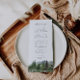 Elevate your wedding reception with this beautifully designed menu card from the Timberline collection by Redwood & Vine Design Co. Featuring a hand-painted green forest and mountain illustration, this vertical menu adds a touch of rustic charm and refined elegance to your table settings. With minimalist typography and ample space to list each course, it's ideal for winter weddings, forest venues, or outdoor celebrations in the mountains. Fully customizable to match your menu and wedding style.