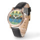 The perfect square face of this watch displays a painted detail of an 1896 Aesthetic Movement wood mantle clock designed by Charles Francis Annesley Voysey, in a beautiful craftsman style color palette. The image reads: "Time and tide wait for no man." .