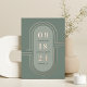 A simple and elegant save the date design with art deco influences, featuring your wedding date, names, and wedding location displayed on an arched central element adorned with rose gold foil line art.