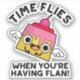 Time Flies When You're Having Flan Food Pun features a cute flan flying because he's having fun . Perfect pun gift for family and friends who love cute food flan puns.