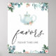 Favors sign featuring an illustration of teapot with a border of blush florals and greenery with the word "favors" in a fun calligraphy script.