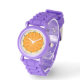Delight in every moment with our playful lavender wristwatch, perfect for children and the young at heart. This charming timepiece features a vibrant orange slice design on its watch face, accented by soft pink hour and minute hands, making telling time a fun experience. Crafted from durable plastic, the watch showcases a sleek lavender band that tapers elegantly to fit the colorful watch face. Set against a stark white backdrop, this eye-catching accessory combines functionality with whimsical design, making it an ideal gift for kids. Embrace style, color, and joy with this delightful wristwatch!