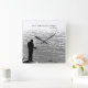 Easily customize or remove the text on this wall clock which features a black and white image of a solitary fisherman standing on a rock ledge at Seneca Lake in Geneva, New York. The text, by the Transcendentalist author, naturalist and philosopher, Henry David Thoreau, reads: Time is but the stream I go a-fishing in. It is taken from Thoreau's famous book, Walden, which he wrote in Concord, Massachusetts about his life in the woods surrounding Walden Pond. It was published in 1854.