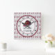This is a fun clock for the kitchen or recreation bar area, with long stemmed wine glasses filled with red wine that form a background pattern. The images are placed on a pale silver background, with a maroon red frame around the black numbers.The center is white, with a cluster grape image and the removable or changeable text that currently says "It's WINE O'CLOCK.