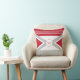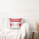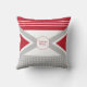 Designed in red and grey, with polka dots, stripes and triangle shapes, cushion, pillow.