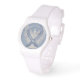 The wrist watch features the art of a silver awareness ribbon angel. The message on the watch notes "TIME 2 HOPE" but it can be customized to change the message to "CURE" or other words. This silver awareness ribbon wrist watches makes for great awareness ribbon jewelry angel gifts! The silver awareness ribbon color means support for Bell's Palsy, Children with Physical or Learning Disabilities, Disability Rights, Dyslexia, Elderly Abuse, Encephalitis, Parkinson's Disease, Schizophrenia, Brain Disorders and the Disabilities- Includes Traumatic Brain Injuries (TBI), and Stalking Awareness. Let this silver ribbon help bring awareness to these causes!