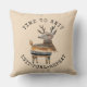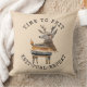 A cute illustrated, time to knit themed throw pillow featuring a reindeer in a winter knitted sweater. The text reads: time to knit and knit purl repeat. A light pastel peach background. A gift for an avid knitter. A unique gift for a knitter or crafters studio.
