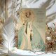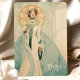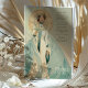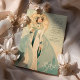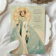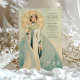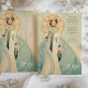 This enchanting Art Nouveau wedding menu card exudes a sense of refined elegance and timeless beauty. The front showcases a regal figure in a flowing white and aqua gown, accented by intricate floral embroidery and a radiant halo of soft golden patterns. A crown of pastel roses and foliage adds a romantic touch, complementing the soft cream and mint backdrop. The back continues the theme with a tastefully displayed menu in a sophisticated serif font, perfect for vintage, garden, or pastel-themed weddings. This card combines artistic detail with soft, romantic colors, making it an unforgettable keepsake for your special day.