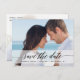 Stylish save the date photo announcement featuring a transparent white banner with elegant modern calligraphy script saying "Save the Date". Postcard.