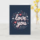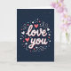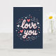 This design shows the words “Love You” centered on a deep indigo background, surrounded by small hearts, dots, and little circles. The lettering is white with a soft coral-pink shadow, so it looks slightly raised and easy to notice. The letters are smooth and flowing, like a neat calligraphy style, and they sit right in the middle of the card. Around the message, you’ll see crisp white hearts, coral-pink dots, and light sky-blue circles, plus tiny specks scattered like confetti. Near the top, a few small gold confetti pieces float across, adding a quiet hint of celebration. The dark background makes the lighter colors stand out, which gives the card a cozy, close-to-the-heart feel 🥰. It’s a simple way to say “I love you” without needing a lot of extra words, and it’s easy to give to a partner or close friend ❤️—a friendly way to share Valentine’s Day feelings.