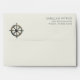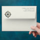 This wedding envelope features a classic nautical theme with an elegant ship's wheel design at its center, rendered in muted earth tones of deep browns and subtle rusts. The layout is simple yet sophisticated, with ample white space that highlights the weathered wood texture and metal accents of the wheel. The typography uses a clean serif font, adding a touch of formality to the timeless maritime aesthetic. Perfect for couples who love the sea, this design conveys a serene and adventurous mood, making it ideal for a beach or coastal-themed wedding.