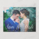 An elegant wedding save the date postcard designed to accommodate your favorite horizontal or landscape oriented full-bleed engagement photo. "Save the date" appears as a white text overlay in hand lettered calligraphy script. Personalize with your names, wedding date and wedding location beneath.