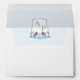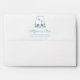 Return Address envelope design. The liner features a pale blue and white Greek Key pattern with a watercolor wedding crest decorated with USA flags and white hydrangeas. All watercolor elements originally handpainted by me before being scanned into digital form. The reverse flap has the name/ return address in blue, and a smaller version of the crest.