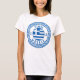 Tinos, Greece women's T-shirt featuring the National Flag Of Greece inside an Ancient Greek pattern circle symbol. Enjoy wearing this T-shirt while you're on vacation on the beautiful Tinos island or give it as a gift souvenir.