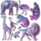 Fantastic set of stickers features blue to purple tinted illustrations of African / Zoo animals including elephant, lion, hippo and giraffe.