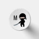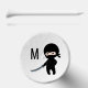 Cute but angry cartoon ninja dressed in black is holding a traditional Japanese katana sword. Customizable initial.