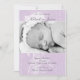 This darling customizable birth announcement features a lilac purple background with a white vintage rose postcard design. Brush courtesy of pinkonhead.com. Other color options available in our store!