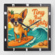 This vibrant wall clock features a "Tiny But Mighty" chihuahua expertly riding a wave, wearing cool sunglasses and a Hawaiian flower. Set against a sunny beach scene with seashells, this playful and colorful design captures the spirit of adventure and is perfect for adding a touch of fun to any dog lover's space.