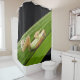 An adorable tiny frog hanging on a leaf on this wonderful shower curtain.