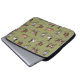 This laptop sleeve has a herd of tiny goats in all different colors on a muted green background.
