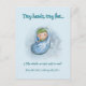 Announce your joyful news with heartwarming charm using this customizable pregnancy announcement postcard! Featuring an adorable, hand-painted baby illustration, this sweet design is perfect for sharing your excitement with friends and family. The front prominently features the beautiful sentiment: "Tiny hands, tiny feet... a little miracle we can't wait to meet! Baby Name arriving Month/Year" Personalize it easily with your baby's name and expected arrival month/year to create a truly special keepsake that celebrates your growing family. A delightful way to share your precious news!