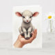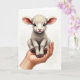 This design shows a tiny fluffy lamb resting in an open human palm, set against a plain white background that keeps all attention on their gentle connection. The lamb’s creamy white coat looks soft and plush, with fine texture that catches the light along its rounded cheeks and forehead. Big dark eyes with faint lashes face forward, giving it a trusting, curious look, as if it’s quietly bonding with the person holding it. A small rosy-pink nose and a slight smile add a friendly, affectionate touch, while oversized ears with pink inner shading frame its face. The hand beneath is shaded in natural skin tones with smooth highlights, cupping the little animal in a careful, protective pose that suggests close friendship. Along the upper area, simple lettering in a soft pastel tone sits neatly spaced, with a smaller line of text placed below in a lighter shade, and a small 🌷 accent nearby. The lamb’s pink inner ears stand out against the white fur, and the bright lighting creates a soft shadow under the palm and along the lamb’s chin.