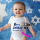 This adorable baby bodysuit is perfect for celebrating Hanukkah with a touch of humor and cuteness! It features the cheerful message “Happy Hanukkah” in bold blue letters, complete with two bright yellow flames that mimic menorah candles. Below, the playful text reads “from Tiny Latke Lover!”—a nod to the delicious Hanukkah treat. The best part? You can customize the bottom text to make it uniquely yours!