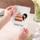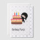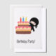 Cute cartoon ninja dressed all in black is peeking from behind a large layered birthday cake with three colorful candles. Customizable text.