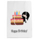 Cute cartoon ninja dressed all in black is peeking from behind a large layered birthday cake with three colorful candles. Customizable text.