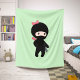 Cute cartoon ninja girl is dressed all in black but for a pink bow on top of her head mask. Traditional Japanese sword katana can be seen attached over her shoulder, it’s handle also colored pink.