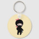 Cute cartoon ninja girl is dressed all in black but for a pink bow on top of her head mask. Traditional Japanese sword katana can be seen attached over her shoulder, it’s handle also colored pink.