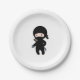 Cute cartoon ninja dressed in black is holding a throwing star. Traditional Japanese sword katana can be seen attached over his shoulder.