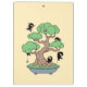 Simple illustration of a Japanese potted bonsai tree in a shallow tray. A group of tiny ninjas made this tree their base. Several ninjas are hiding behind the foliage. One is dangling from a rope tied to a branch, another hovers above the tree strapped to a kite.
