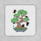 Simple illustration of a Japanese potted bonsai tree in a shallow tray. A group of tiny ninjas made this tree their base. Several ninjas are hiding behind the foliage. One is dangling from a rope tied to a branch, another hovers above the tree strapped to a kite.