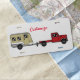Small towable camper caravan, gypsy traveler lifestyle RV behind flatbed truck to customize on any color background, personalize by changing to your name