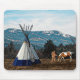 An image of a Native American and his horse near a tipi. Snow has settled on the higher slopes of the mountains in the background.