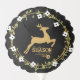 Tis the Season design holiday balloon features a black background, golden text that reads Tis the Season to be Jolly Fa la la la la la la la la on both sides, snowflakes of gold on back, a laurel wreath and gold deer on front.