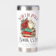 A festive and cheerful Christmas design showcasing a stack of red and green books adorned with poinsettia flowers, fern branches, and a steaming cup of hot cocoa topped with whipped cream. The vibrant text says, "North Pole Book Club, 'Tis the Season to Be Reading." This delightful design is available on a range of products that make perfect gifts for book lovers.