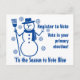Remind your friends to register and vote because 'tis the season to vote blue, to vote for Democrats. This wintry design is perfect for 2024 primary election season and for the general election in November 2024. It's time we all got back to focusing on improving this country for everyone instead of having to waste so much time fighting the GOP's bigoted destructive policies, and their promoters and enablers. To do that, we first have to spend time getting out the vote of our reluctant, hesitant, and/or discouraged friends. Democrats aren't perfect, but we're adults and we vote for the best option available. Vote Blue. Vote Democrat. Design description: All text is template text that you can customize. The color are blue on white. The main visual part of the design is the outline of a snow person, with a jaunty hat and scarf, with snowflakes falling around them. The snow person is holding a broom in one hand, to sweep out the bad, and the other hand points to template text that reads, "Register to Vote." Below that is another template that reads, "Vote in your primary election!" but you can change that to the election date or to the general election. Centered across the bottom, in a snow-capped font, are the words, "'Tis the Season to Vote Blue."