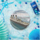 Famous Titanic ship floating among icebergs on the water by cloudy day