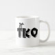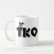TKO written in Asian style font, black English writing. On the top of the technical knock out initials are the silhouettes of two MMA fighters are sparing, one wearing blue gloves & one red, which are the traditional MMA colors.
