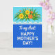 This greeting card features a three-part horizontal layout that feels like a friendly hug across the page ❤️. The top section shows a sky-blue background filled with a loose bouquet of sunny yellow daisy-like flowers and warm orange blooms, surrounded by long green leaves and small buds that lean toward each other like close friends. Between the flowers and the message sits a thin white lace-like band, adding a gentle, decorative pause. The bottom section is a deep royal blue panel that sets a calm, steady mood beneath the lively garden above 🌼. Centered on this blue area, the line “To my Aunt:” appears in white, flowing lettering near the top of the panel. Just below it, “HAPPY MOTHER’S DAY!” is placed in larger white uppercase letters, strong and easy to read. The yellow blossoms cluster most densely toward the upper left, with orange flowers and green leaves stretching across the top edge against the open blue sky.
