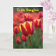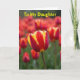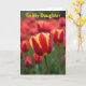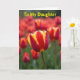 This design shows a close-up tulip standing tall among softly blurred blooms, like one flower leaning in for a quiet, affectionate moment 🌷. Its petals are deep red with golden-yellow edging that traces each curve, giving the bloom a glowing outline. Behind it, more tulips fade into a warm wash of reds and oranges, creating depth like a garden seen through gentle, dreamy focus. Green stems and leaves rise from below and thread through the background, adding a calm, grounding contrast to the hot petal colors. Across the top, the words “To My Daughter” sit in bright yellow lettering, centered and easy to spot against the warmer tones. The overall light is diffused and soft, as if filtered through a thin morning cloud, making the colors look rich without sharp shadows 🐇. The main tulip’s textured petals appear crisp in the foreground while the surrounding flowers dissolve into a smooth, painterly haze. The yellow text rests above the flower heads, with the central tulip positioned just beneath it in the middle of the frame.