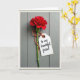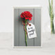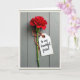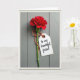 Designed with a single dramatic red flower as the focus, this card centers the ruffled bloom high on the page like a fresh gift held close ❤️. A slim green stem runs straight down the middle, giving the scene a calm, steady line that feels like a supportive friend standing beside you. Behind it, cool gray-blue wooden boards show faint grain and soft brush marks, adding a quiet, rustic setting. Near the lower stem, a piece of twine braided with warm orange and creamy white is tied in a neat knot, like a small promise kept. Hanging from it is an aged cream tag with worn edges and a tiny bronze-toned ring, suggesting it’s been saved and reread. The message “to my beautiful friend” sits on the tag in flowing dark ink, slightly angled, as if written with a gentle hand 🌼. The rich red petals flare outward with layered folds, glowing against the muted boards while the tag rests just to the right of the stem.