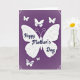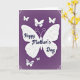 This card features a deep purple background with a softly textured, fabric-like look that feels cozy and intimate ❤️. At the center, a large white butterfly spreads wide wings decorated with faint curling patterns, like delicate lace. Across the butterfly’s body, the text “Happy Mother’s Day” appears in flowing white lettering, stretching neatly from left wing to right wing. Several smaller white butterflies flutter nearby, arranged so they seem to circle the main one like close companions. One small butterfly includes the word “SISTER” in white lettering, and another lower butterfly reads “To My SISTER,” suggesting a caring, sisterly bond in the way they hover close together. Gentle floral corner details in pale white peek from the top and bottom edges, adding a soft garden touch 🌼. The upper corners show fine, lace-like blossoms and curling leaves against the purple field.