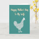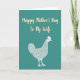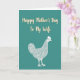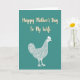 The front design shows a calm teal background that sets a gentle, cozy mood for Mother’s Day ❤️. Across the upper half, the words “Happy Mother’s Day To My Wife” appear in a creamy light color with a faint golden outline, centered so they’re the first thing you notice. The lettering has smooth, flowing strokes that feel affectionate, like a note written with care. Below the text sits a detailed hen illustration drawn with fine white lines, giving the feathers a soft, textured look. Its upright stance and alert eye add a protective, caring presence, like it’s quietly watching over home and family. The simple color palette keeps everything easy to read while letting the warm message stand out 🌼. The hen is placed in the lower portion of the design, facing slightly to one side with delicate linework defining the wing, tail, and comb.