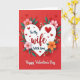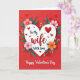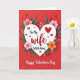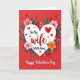 This Valentine's Day card features a deep crimson background with faint floral shapes and tiny white hearts scattered across it. In the center, a large white heart sits at a slight angle, like a bright note placed on top of the red backdrop. Inside that heart, the words “To My wife With love” appear, with most of the letters in deep blue and the word “wife” standing out in red with smooth, flowing letters. Around the main heart, you’ll see pink and orange flowers with golden centers, along with green leaves that curl in between the petals. Small red hearts float near the center and around the design, adding extra reminders of love ❤️. Along the bottom, “Happy Valentine’s Day” is written in white in the same flowing letter style, centered and easy to spot. It feels meaningful to give because the message is direct and tender, and the colors make it feel warm and close. Hope it helps you share Valentine’s Day sentiments with someone you care about 🥰.