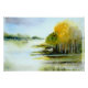 This painting is a spacious aquarel landscape with soft, fluid lines and a dreamy look. On the foreground, we see a group of trees in hot autumn shades, which contrast nicely with the cool blue and green of the water and the air. The light mist and subtle color transitions give the work a serene, almost mystical atmosphere. The composition calls for peace of mind and reflection, and poetically captures nature's silence.