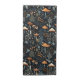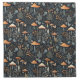 This whimsical design features terracotta toadstool mushrooms on a dark navy blue background with forest berries and fauna.